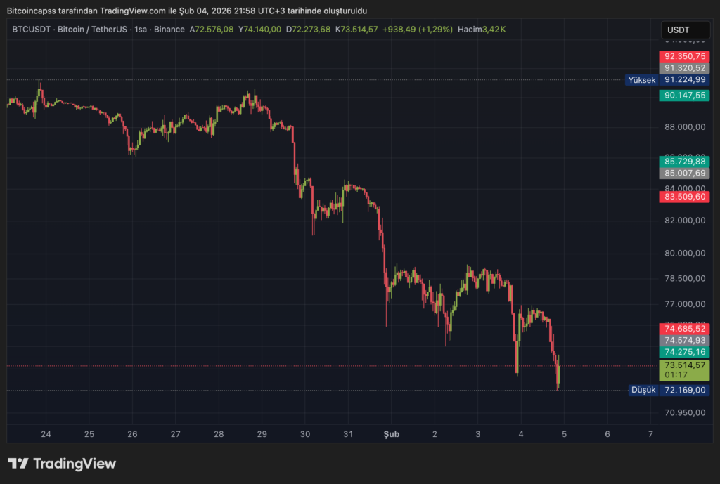 Bitcoin, ABD seansının ilk saatlerinde yeniden 74 bin dolar seviyesinin altına sarktı. Önceki gün görülen kısa süreli toparlanma kalıcı olmazken, küresel piyasalarda özellikle teknoloji hisselerinde yaşanan satışlar kripto piyasasını da aşağı çekti.
